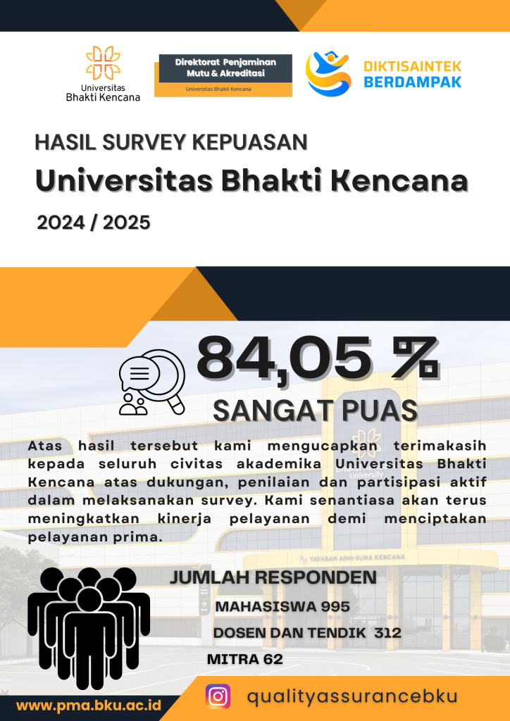 Universitas Bhakti Kencana mengucapkan terima kasih yang sebesar-besarnya kepada seluruh mahasiswa, dosen, staf, dan pihak terkait yang telah berpartisipasi dalam Survey Kepuasan Tahun Ajaran 2024/2025. Suara Anda sangat berharga bagi kami untuk terus meningkatkan kualitas layanan, akademik, dan lingkungan kampus yang lebih baik.